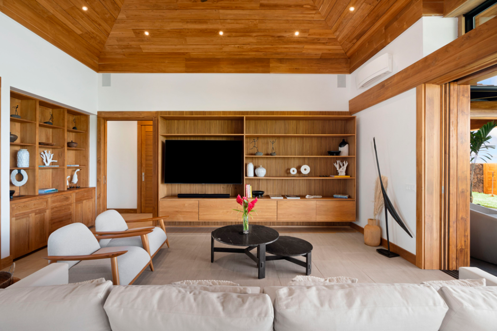 A masterclass in "Tropical Modernism". This estate features floor-to-ceiling custom Teak cabinetry and wide-plank flooring that transitions seamlessly to the lanai, designed to withstand the humid Kauai climate without losing its structural grace.